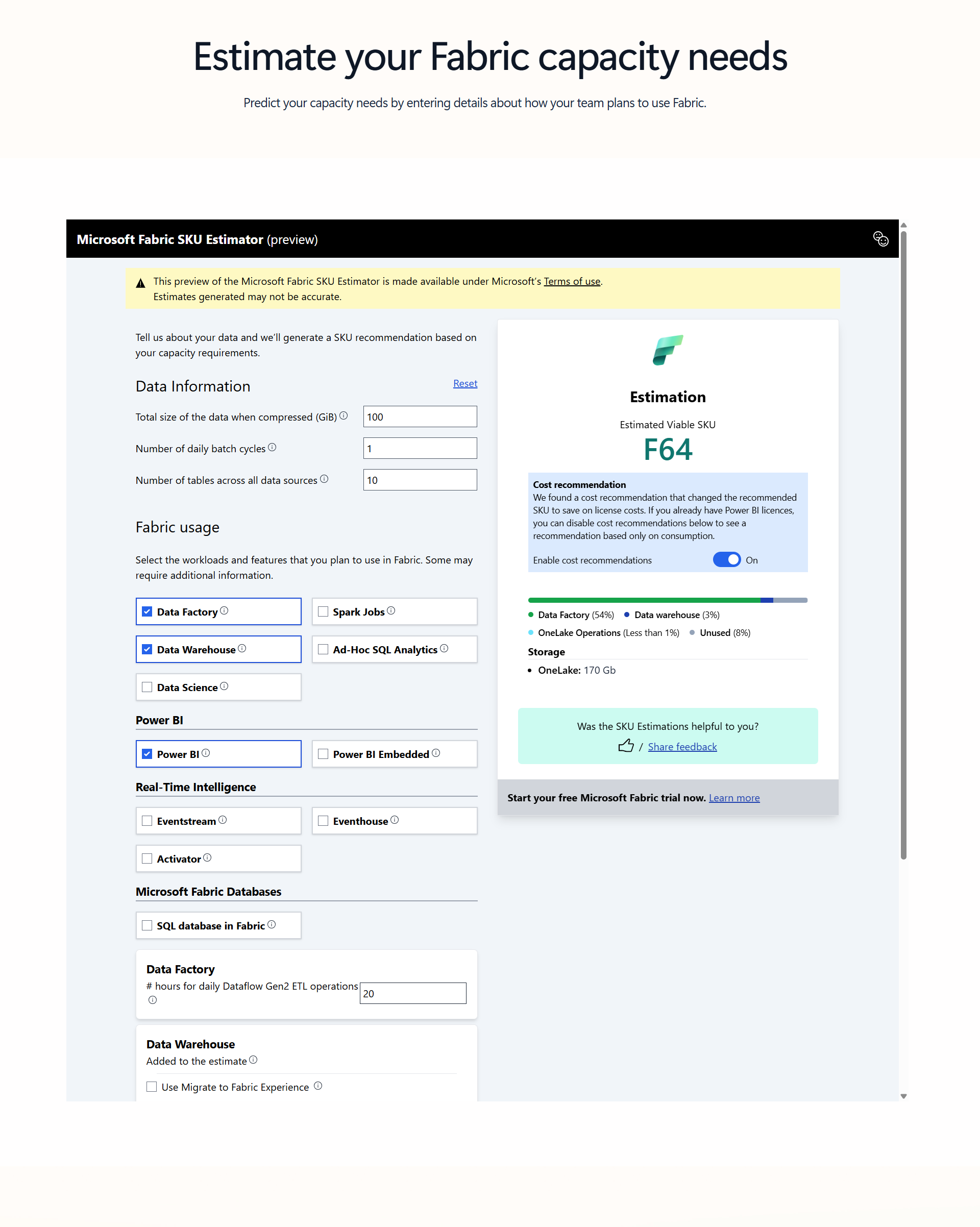 - Total size of data: Estimated total size (after compression) that will reside in OneLake. Influences OneLake storage cost.